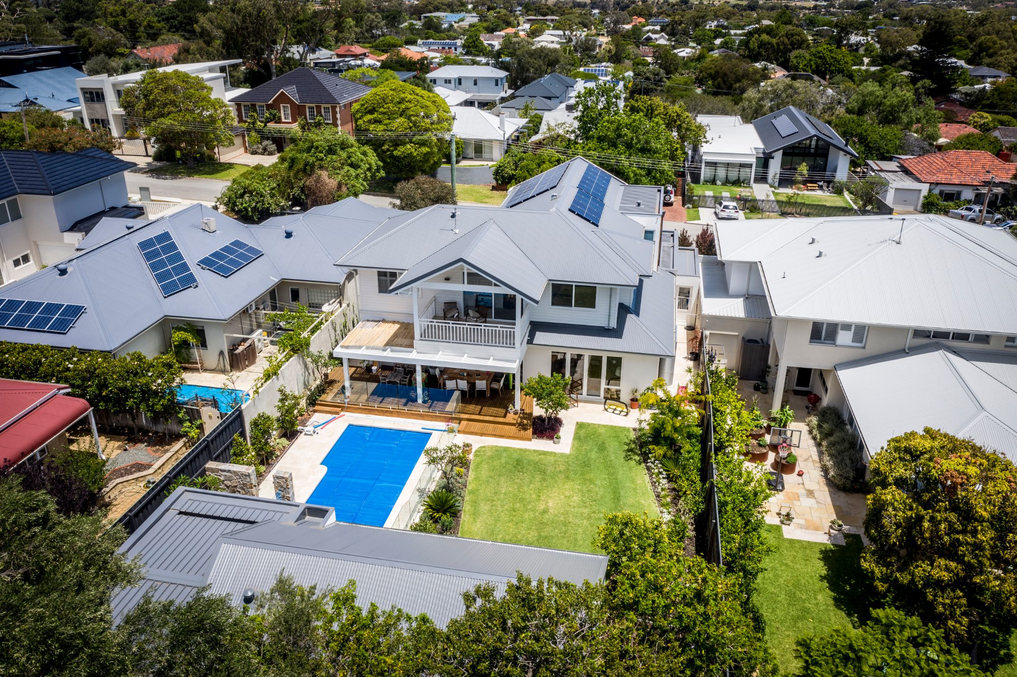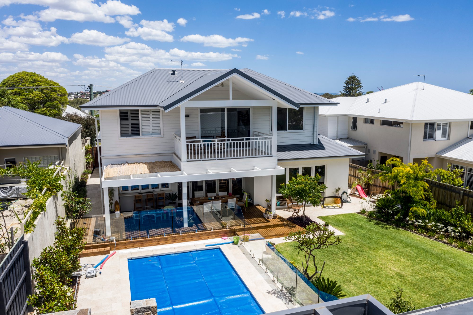 Newly designed two-storey home with pool and separate pool house to the rear, for a client and their growing family. We worked with the clients on the initial concepts, approvals, plans, construction and landscaping to provide a full turn-key project.